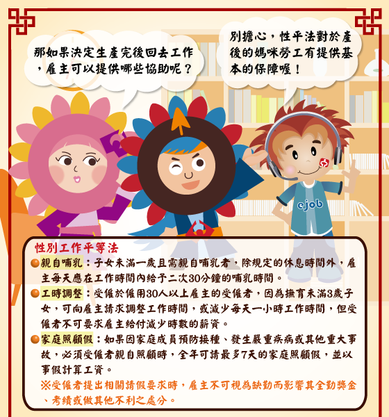 …以上的疑問,就由勞保局的小葵及全國就業e網的賈伯斯聯手合作,來替粉絲們解答,並再增加說明與提醒:請領生育給付時需留意的事項,以及雇主應該提供給勞工媽媽的保障喔!