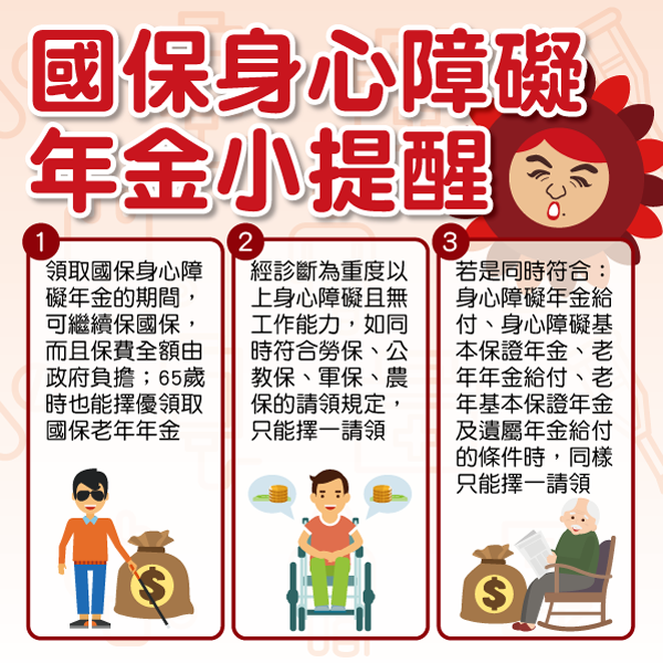 這部分請大家可以放心,在領取身心障礙年金給付的期間,還是可以繼續保國保,而且保費會由政府全額補助,保險年資也會繼續累積!年滿65歲時,也可以選擇改領老年年金喔~