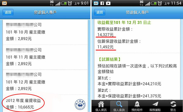 這是一位民眾使用手機查詢「個人勞退專戶」的畫面,