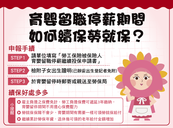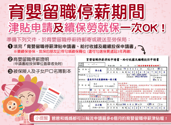 如果在請領育嬰留職停薪津貼時,也想要續保勞、就保,現在辦理手續也變簡單囉~只要申請時,填寫一次「育嬰留職停薪津貼及續保申請書」就可以同時辦理好了