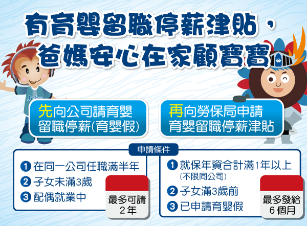 - 想要申請的爸爸或媽媽在同一公司任職滿6個月,且在小孩滿3歲前,可以申請育嬰留職停薪