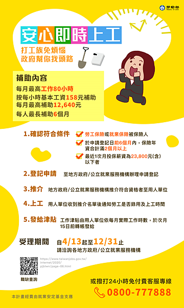 為協助受疫情影響之部分工時者,透過「安心即時上工計畫」,由政府提供符合公共利益之計時工作,並核給工作津貼,降低薪資減損對其生活造成之影響。