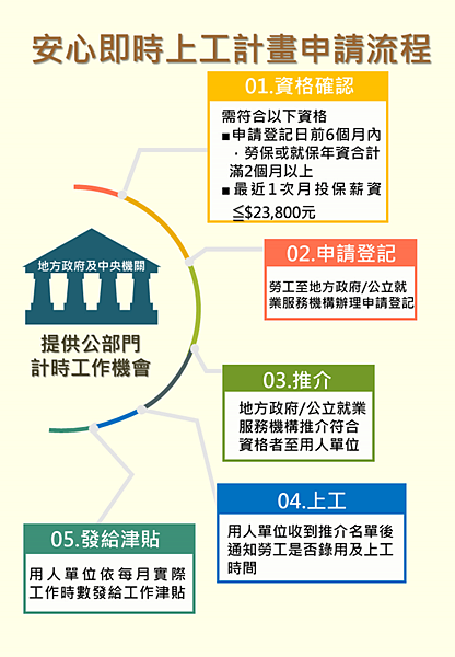 由各地方政府及公立就業服務機構受理民眾申請登記,推介符合資格之民眾至公部門從事計時工作。