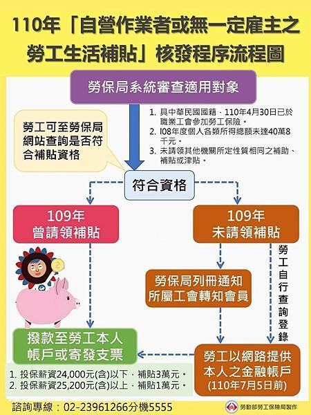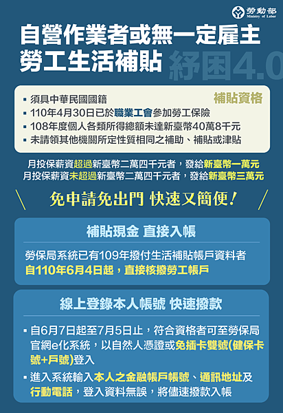擴大辦理本(110)年度「自營作業者或無一定雇主之勞工生活補貼」,