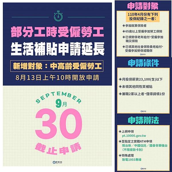 「部分工時受僱勞工生活補貼擴大資格,申請延長至9月底。」