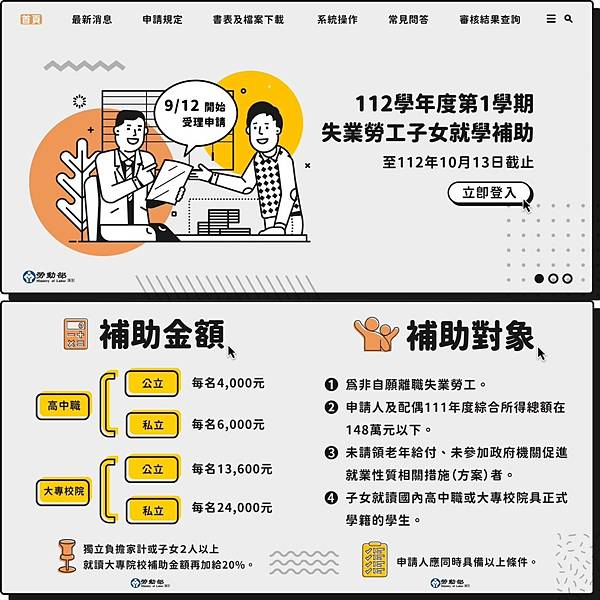 ◆For inquiries, you can contact the Ministry of Labor's Unemployed Workers' Child Education Subsidy Acceptance Team at 02-77563956 or call the toll-free hotline 1955