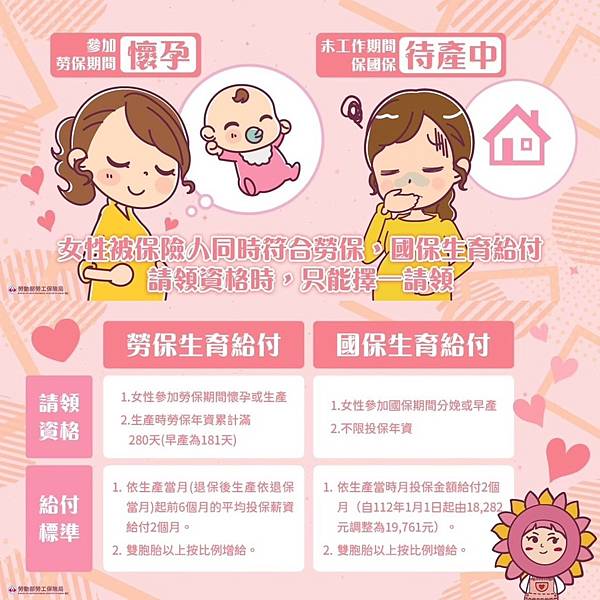 若是同時符合勞保和國保生育給付的請領資格,只能擇一請領喔!