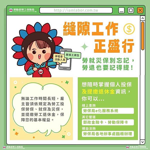 雖然縫隙工作彈性高,並不代表勞動權益可以被忽略,勞保局提醒,只要是受僱於登記有案單位的勞工,不論工作時間長短,雇主都必須依規定為勞工投保勞工保險、就業保險及勞工職業災害保險,並提繳勞工退休金,以保障員工權益並避免受罰