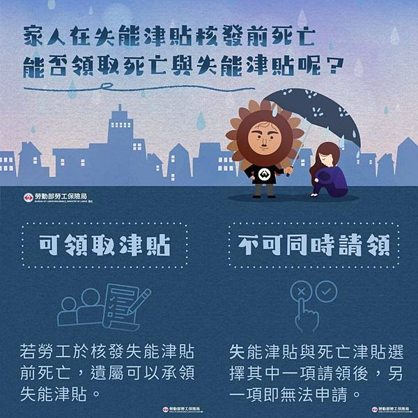 家人在災保失能津貼核發前死亡,符合災保死亡津貼請領規定,兩者不可同時請領,遺屬只能選擇其中一項請領。