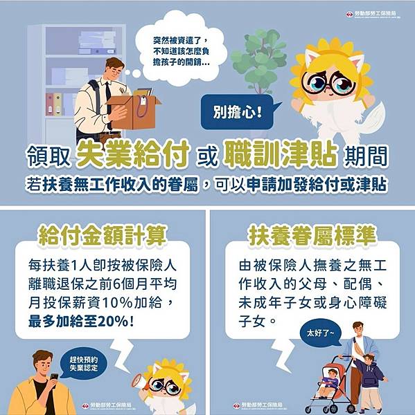 失業勞工於領取就業保險失業給付或職業訓練生活津貼期間,若有扶養無工作收入的父母、配偶、未成年子女或身心障礙子女,可申請加發給付或津貼哦