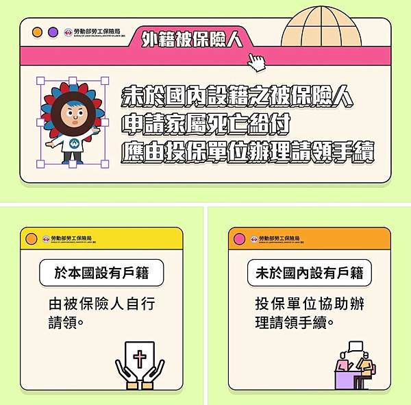 * The insured person who does not have household registration in the ROC, in order to protect their rights and prevent issues caused by language barriers or unfamiliarity with legal procedures, the application process should be assisted by the insured unit.